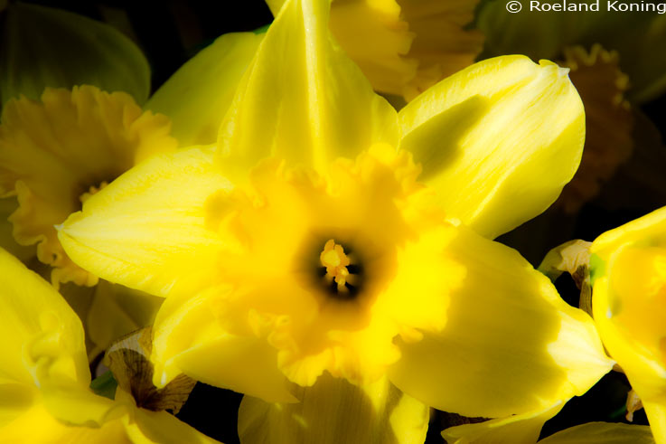 Narcissen in de Bollenstreek. De naam is afkomstig uit de Griekse mythologie (zie Narcissus (mythologie)). Narcissen zijn voorjaarsbollen en hebben een koude rustperiode nodig. Je vindt narcissen in vele soorten en kleuren: roze, oranje, rode, witte of gevlekte, dubbelbloemige bloemen, met grote gele trompetten of met trosjes van gele of witte bloemen. |
