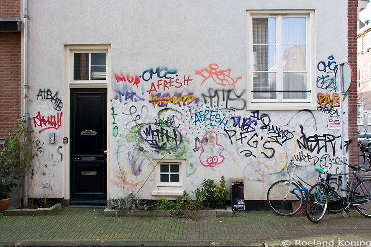 | Eerste Goudsbloemdwarsstraat Graffiti gepruts op een muur. Kijk hieronder voor een reisje door de tijd. Foto 26-01-2017. | |