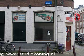 Straathoek tegenover de foto's hierboven, Tweede Goudsbloemdwarsstraat (ZW hoek) Willemstraat. Met ouderwetse 7-UP reclame; Toen onze oudste zoon Wessel een frummeltje was wilde hij, als ik kon kiezen, altijd een "frisse nip" drinken. ( Tweede Dikkedennisdwarsstraat ) Vernoemd naar de tatooeerder Dikke Dennis (Dennis Hendrik Overweg ) die in deze straat zijn zaak had. 30-03-2008 |