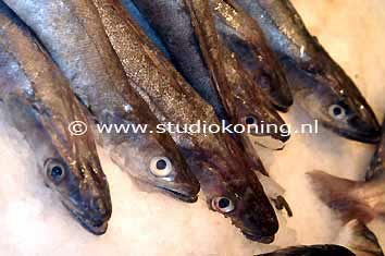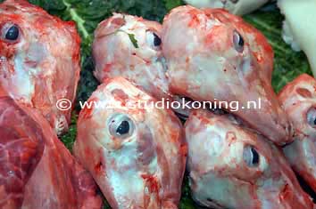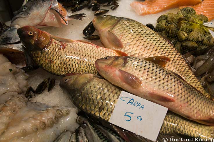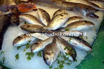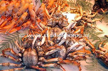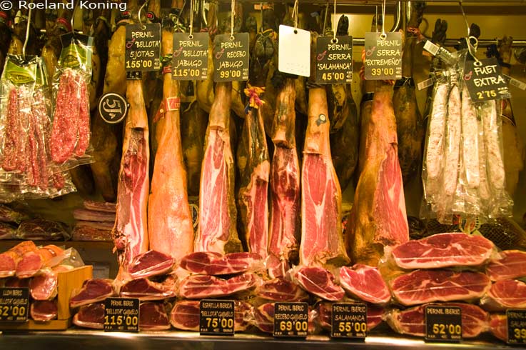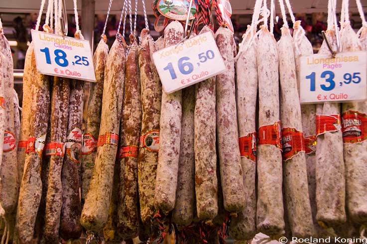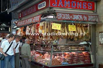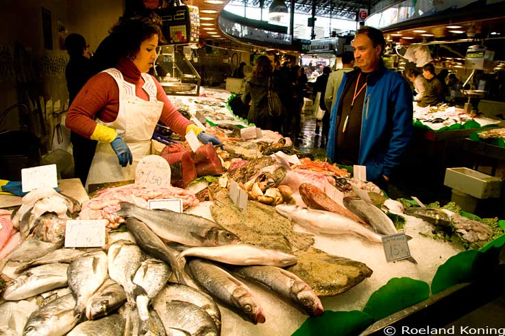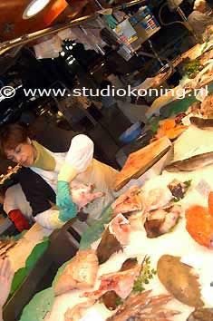 Visstal in de Boqueria; De Boqueria markt heeft een verkoopoppervlakte van 2.583 m˛ en wordt omringd door een gebouwengalerij. Vanaf 1217 is bekend dat men tafels plaatste voor de verkoop van vlees bij de stadspoort Boqueria. |