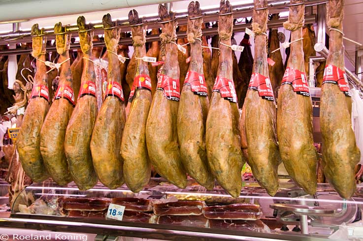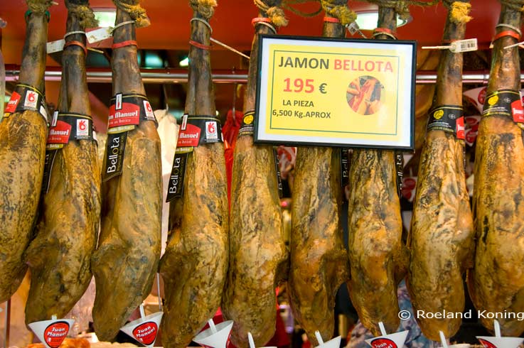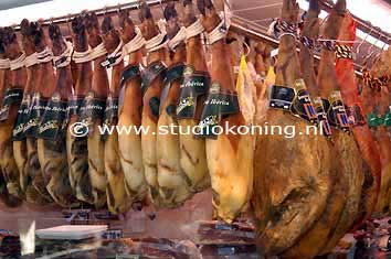 Iberische hammen. Jamón Iberico de Cebo van Juan Manuel Hernández. Arte Iberico. De Ibérico ham van het varken wordt officieel geclassificeerd in verschillende kwaliteiten: van Jamón Ibérico de Cebo, Jamón Ibérico de Cebo Campo, Jamón Ibérico de Recebo tot (de beste) Jamón Ibérico de Bellota. ( In de volksmond: Pata negra genoemd ) |