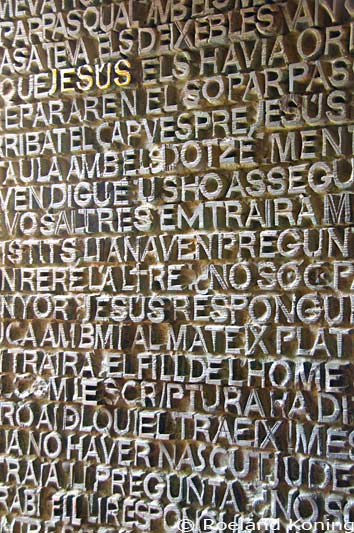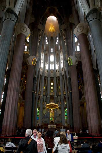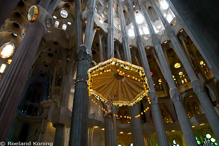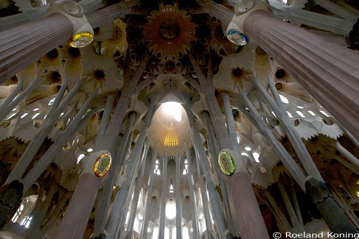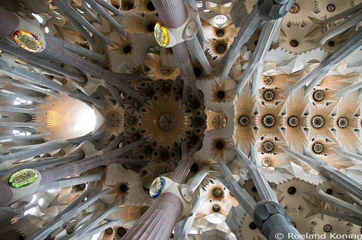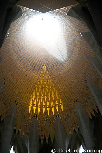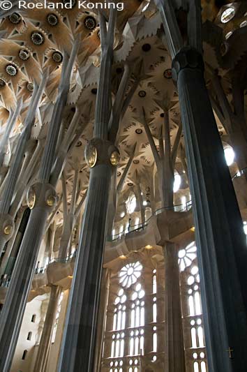 | Basílica i Temple Expiatori de la Sagrada Família, is een kerk in Barcelona ontworpen door de architectAntoni Gaudi ( 1852-1926). De naam betekent Heilige familie. Sinds de eerste steen in 1882 wordt nog steeds aan de kerk gebouwd en is hij vanbuiten nog niet gereed. Men houdt het erop dat het gebouw "klaar zou kunnen zijn ergens in het eerste derde van de 21ste eeuw". De snelheid waarmee de bouw vordert, is voor een groot deel afhankelijk van de hoeveelheid giften die bezoekers binnenbrengen. De bouw duurt inmiddels al zo lang, dat voltooide gedeelten al gerestaureerd moeten worden. De kerk werd op 7 november 2010 door Paus Benedictus XVI gewijd. Op bovenstaande foto het gewelf van het schip. | |