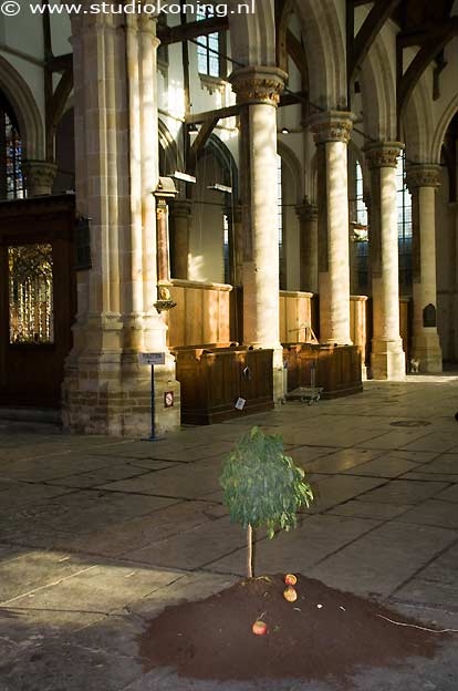 Zag ik op 31-01-2009 nog het schitterende, gedurfde en uiterst vernieuwende examenwerk van een studente der Koninklijke Academie van Beeldende Kunst in Den Haag, getiteld: "My little garden", een hoopje aarde in een hoekje van een ruimte, een eindexamen studente van de Rietvelt Academie in Amsterdam, wist haar ruimschoots te overtreffen door bovenstaand tuintje geheel vrijstaand in de ruimte te plaatsen in de Oudekerk van Amsterdam. Ook bekroonde zij haar kunstwerk met een kunststof boompje, een elektriciteitsdraad en drie namaak appeltjes. 06-02-2009 |