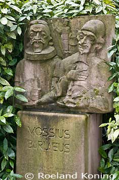 | Oudemanhuispoort, beeld van Vossius en Barlaeus, oprichters van het Athenaeum Illustre, de voorloper van de Universiteit van Amsterdam. Barlaeus leed aan ernstige waandenkbeelden. Zo dacht hij soms dat hij van stro was en in brand zou kunnen vliegen en op andere momenten meende hij van glas te zijn en een groot risico te hebben te kunnen breken. Men vermoedt dat hij in 1648 zelfmoord pleegde. Naar hem zijn de Van Baerlestraat en het Barlaeus gymnasium vernoemd. | |