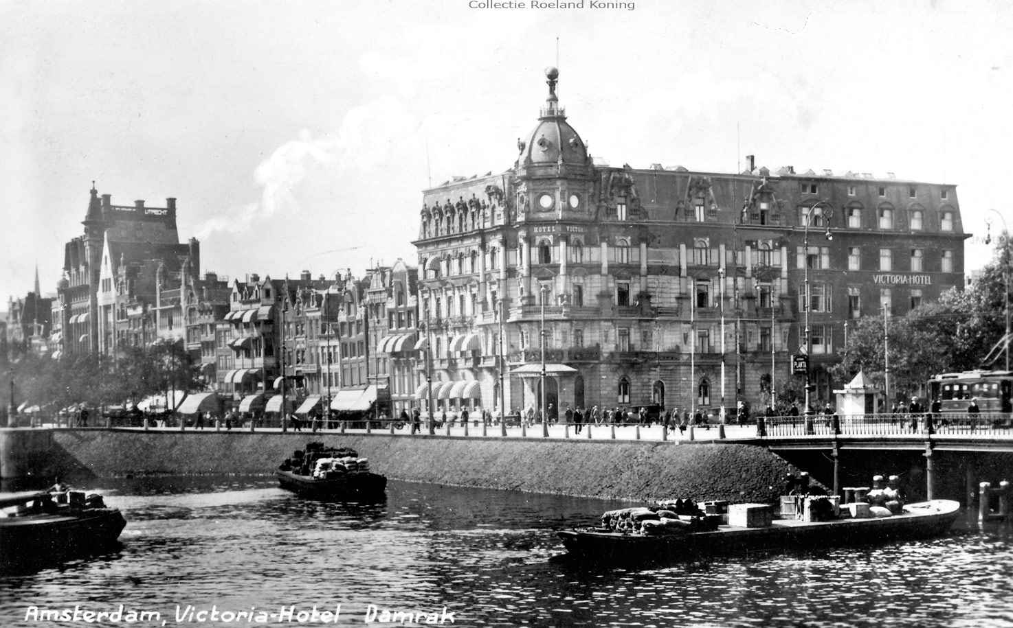 Prins Hendrikkade, Victoriahotel dat in 1890 werd geopend. In 1889 verscheen in de Amsterdamsche Courant het bericht dat het hotel vijf huizen aan het Damrak en drie op de Prins Hendrikkade had aangekocht. Daaronder bevond zich het historische, uit 1633 daterende Huis-met-het-torentje, dat eeuwenlang de hoek van het Damrak had gemarkeerd. Niet alle panden waar de vennootschap haar zinnen op gezet had, konden worden verworven. Twee huisjes bleven vanwege de te hoge vraagprijs onbereikbaar. Toen de tijd begon te dringen besloot men maar om de oude huisjes heen te bouwen. Dit verklaart de twee bijzondere, door het hotel ingekapselde geveltjes.(Bron Wkipedia). Foto jaren 20 van de 20ste eeuw. Hetzelfde verhaal zie je in Haarlem bij het gebouw van V&D en de oude drogisterij van Van der Pigge. Dat was voor het Victoria hotel best wel een dingetje en daarom liet met de twee huisje verdwijnen op bovenstaande kaart. Klik op de foto voor een veel groter beeld. | |