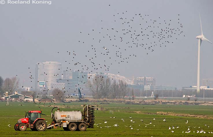 Tegenwoordig wordt de drijfmest geïnjecteerd in de grond, er komen veel vogels op af. |