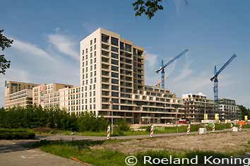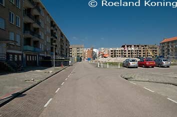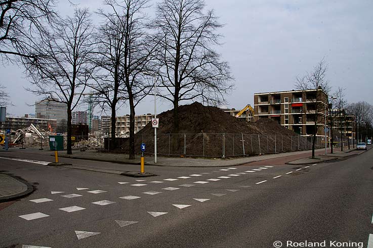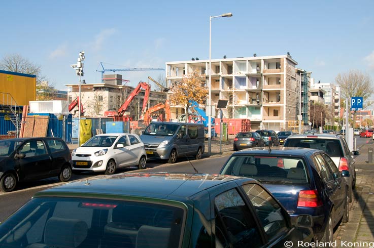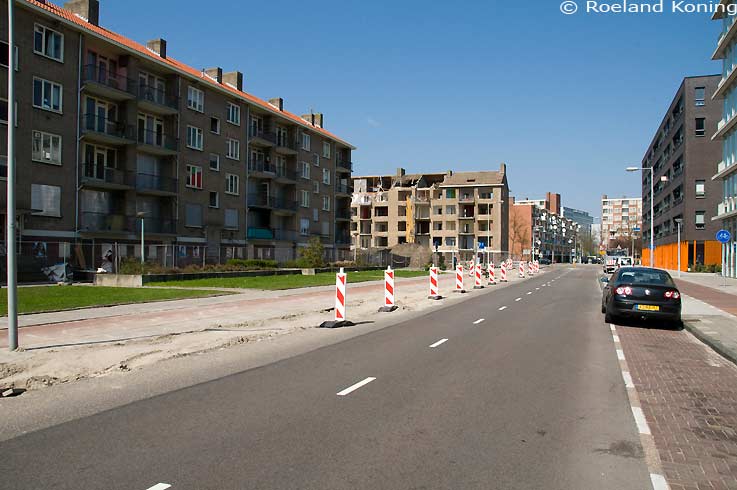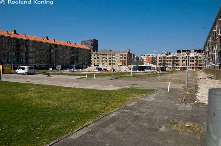 Hart Nibbrigstraat links, kijkend vanaf de Johannes Hilverdinkstraat naar ( NW ) Uiterst rechts de achterzijde van de Derkinderenstraat en in het midden de gesloopte flats van de Louis Apolstraat. 12-04-2010. |