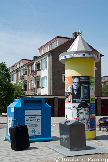 | Johan Huizingalaan bij het Sierplein. Foto 24-06-2015 | "Left luggage" bij de plakzuil in de Louis Bouwmeesterstraat. Foto 24-06-2015 |