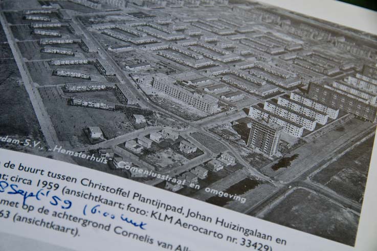 | Van een aardige oudere heer in het Colenbrandershof kreeg ik dit boekje te zien. Rechtsvoor de Sloterhofflat in aanbouw. De hijskraan staat op het dak. Foto van 09-09-1959 KLM Aerocarto. 28-09-2012 | |