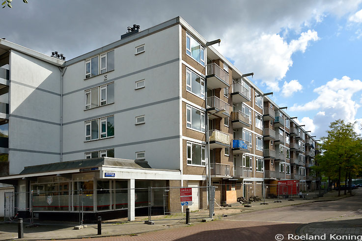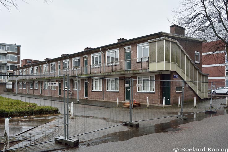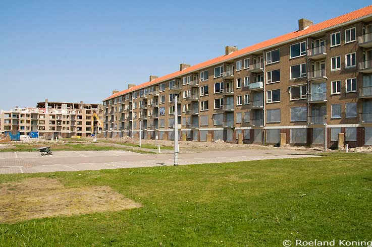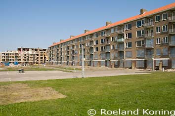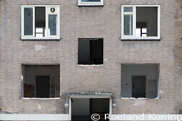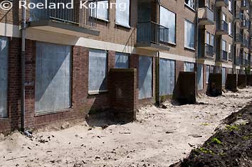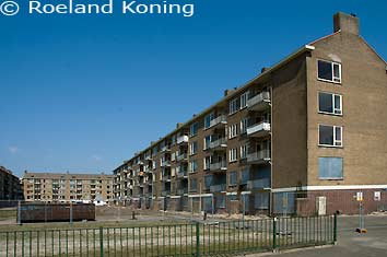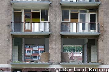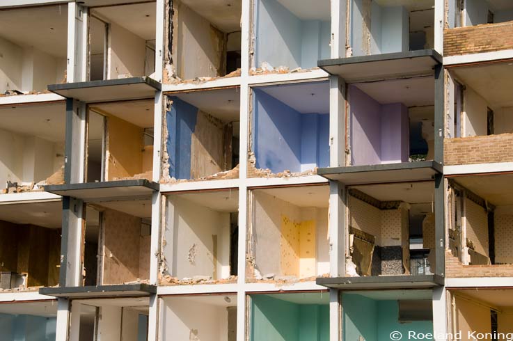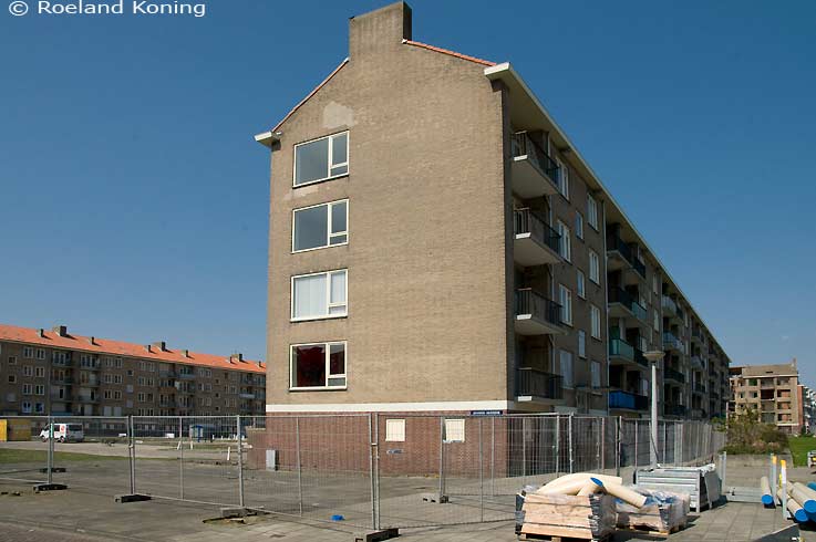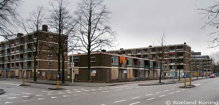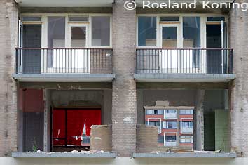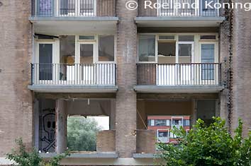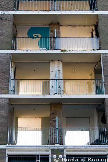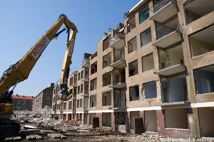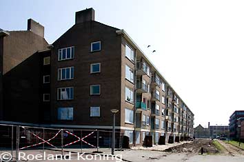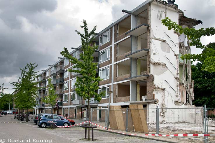 | De flats aan de Suze Robertsonstraat worden gesloopt. De mevrouw die midden links op de foto op het balkon van de eerste verdieping haar was buiten hangt wist me te vertellen dat zij er nog even konden blijven wonen. ; Foto kijkend naar NO; 08-06-2012 | |
