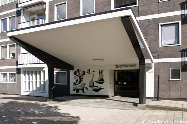 | De Sloterhof is een woningbouwproject aan de Comeniusstraat evenwijdig aan de Cornelis Lelylaan, dat vanaf 1958 werd opgeleverd. Het bestaat uit dertien portiekflats (vier woonlagen) drie hoogbouwblokken (zeven woonlagen), een torenflat met twaalf woonlagen en een blok met atelierwoningen. De architect was J.F. Berghoef (1903-1994), die we ook kennen van de Burgemeesterswoning van Ouder Amstel. Sloterhof is een van de bekendste voorbeelden van toepassing van systeembouw in de naoorlogse woningbouw. Op de foto het twaalf verdiepingen tellende flatgebouw de Sloterhof aan de Hemsterhuisstraat, hoek Comeniusstraat Wikipedia Sloterhof met rechts enkele portiekflats. Foto 28-09-2012 | |
