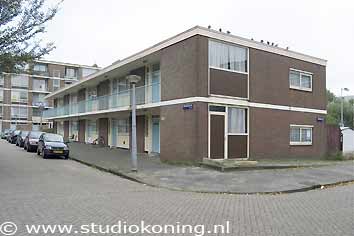 Henk Henriëtstraat, ( kijkend naar( Noord Oost ) de achtergevel van de Jan Voermanstraat, rechts de achterkant van de flats aan de Hart Nibbrigstraat. Vanaf het Mondriaanplein. 18-07-2009 |