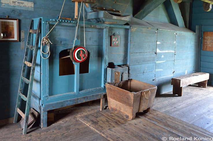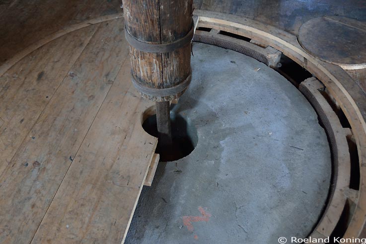| Onder in de molen een ingenieus jacobsladdertje om de gerst naar het molensteenl boven te transporteren en hier de opvang van de gepelde gerst. | |