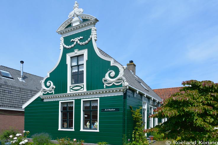 | Westzaan, "In de Oranjeboom", J.J. Allanstraat 328, een houten huis met een ingezwenkt en versierd voorschot met snijwerk, ca 1750. | |