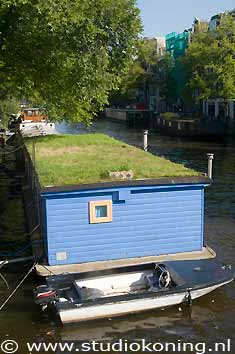 Woonboot met gras op het dak, Prinsengracht Amsterdam |