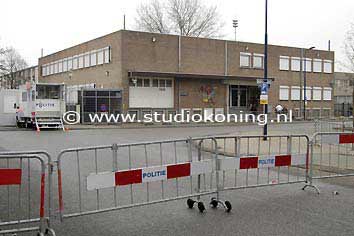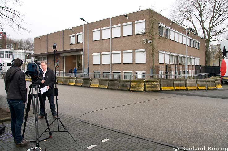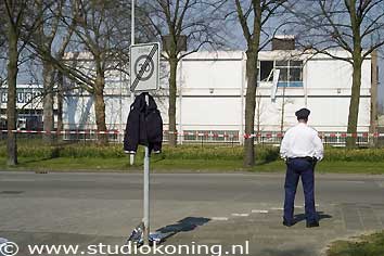 Gevolgen van de aanslag op de extra beveiligde rechtbank "de Bunker" aan de vooravond van het Holleeder proces, Amsterdam Osdorp. 02-04-2007. Foto vanuit de Duikerstraat |