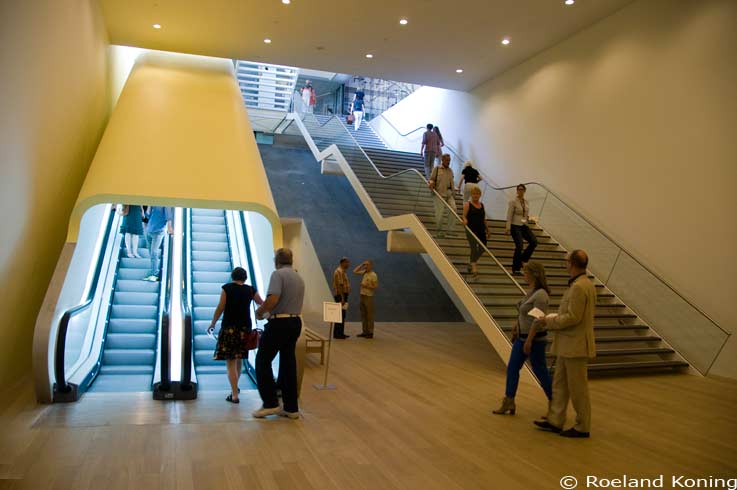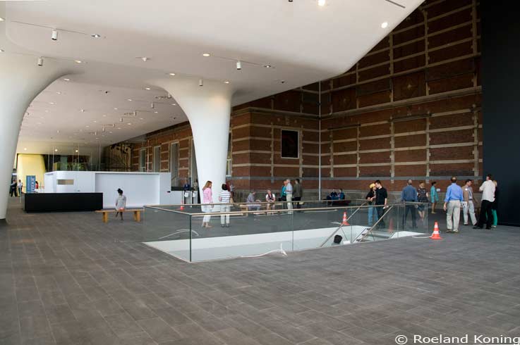 De entree van het museum is verplaatst van de Paulus Potterstraat naar de kant van het Museumplein . Eenmaal binnen bevindt men zich onder een badkuip die op poten blijkt te staan. Ik werd overvallen door een een Madurodam gevoel. Het donkere vlak in het midden van de foto in het oude gebouw is het transparante gedeelte van het kunstwerk van Karel Appel. Helaas komt er door de nieuwbouw niet genoeg licht meer door om het echt te laten opvallen. Foto 26-05-2012 | ||||||||||||||||||||||||||||||||||||||||