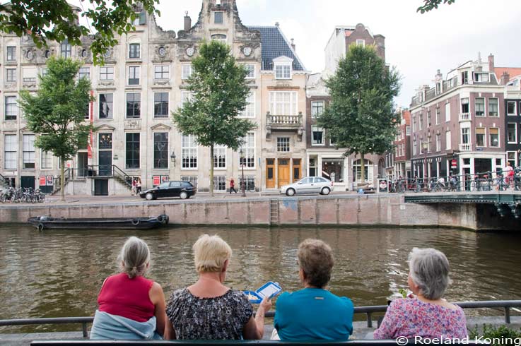 | Open Monumentendag 2012; Herengracht, voor de Cromhout huizen, Met z'n vieren uit de provincie, in de trein en eten uit het broodtrommeltje. foto 08-09-2012 | |