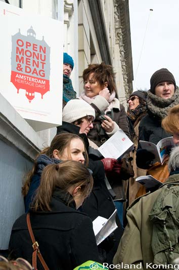 Open Monumentendag 2011; 10-09-2011 wachten op de rondleiding op de stoep van Herengracht 480 het kantoor van Mr. Oscar Hammerstein |