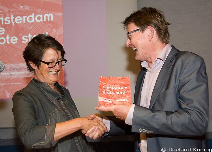 | Boudewijn Oranje stadsdeelvoorzitter Centrum ontvangt het eerste exemplaar van "Amsterdam die grote stad" uit handen van schooldirecteur Saskia Grotenhuis. Foto 18-09-2015 |