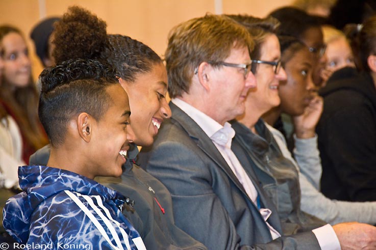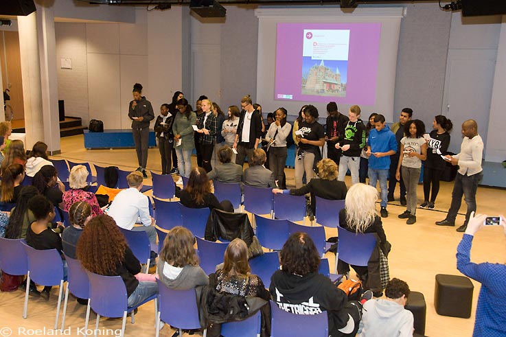 Open Schoolgemeenschap Bijlmer en School der Poëzie maakten een feestelijke presentatie van AMSTERDAM DIE GROTE STAD op vrijdag 18 september. Boudewijn Oranje stadsdeelvoorzitter Centrum ontvangt het eerste exemplaar uit handen van directeur Saskia Grotenhuis Jongeren dragen in een parade hun stadsgedichten voor. AMSTERDAM DIE GROTE STAD is een bundel met verhalen gedichten liedjes en foto’s De bundel verhaalt over Kwaku AMS-IX de Pijp Foodhallen Hotspots over het IJ maar ook over het ontstaan van Amsterdam de grachten, VOC, Rembrandt, handel in slaven, multiculturele stad, de Tweede Wereldoorlog, vrijheid van meningsuiting en veel meer Er zijn niet alleen gedichten opgenomen van oa Gorter Wilmink Ozon Stitou K. Michel en Antoine de Kom maar ook van stadsdichter Enquist en een sprankelend fragment van Zwart Licht. Foto 18-09-2015 |