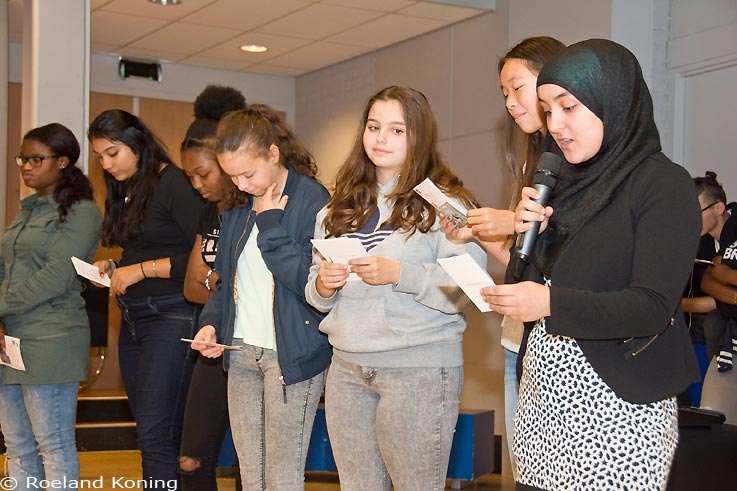 | Open Schoolgemeenschap Bijlmer. Kinderen declameren zelf geschreven gedichten. Foto 18-09-2015 |
