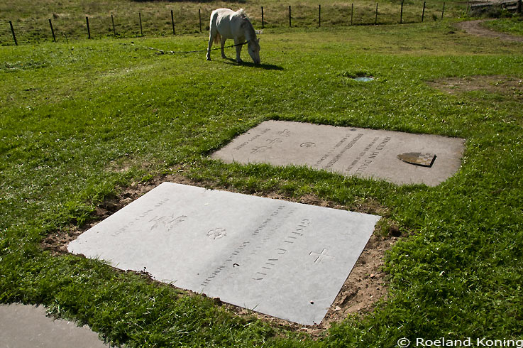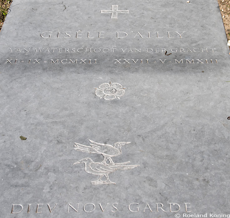 Laatste rustplaats van Gisèle d'Ailly-van Waterschoot van der Gracht naast het graf van haar man Arnold D' Ailly op het kerhofje van Spaarnwoude, foto 28-09-2013 |