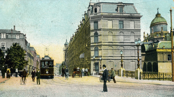 Het Westeinde in 1904, met rechts de bewouwing van de gallerij van Het Paleis voor Volksvlijt (A.L. van Gendt. Ansichtkaart. Foto vanaf de Stadhouderskade naar Noord, ter hoogte van de Van Woustraat. |