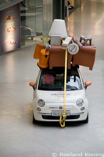De crisis heeft toegeslagen in Villa ArenA. Wie gaat er ook met een klein autootje meubels kopen om ze meteen mee te nemen? Bijna alle meubels in die woonmall hebben een lange levertijd en die kan je niet meteen meenemen. Zo'n derde deel van alle winkels staat leeg en ik zag bijna geen winkelend publiek. Een angstaanjagende stilte.... "Nee korting geven we niet". Foto 15-03-2013 |