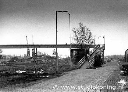 | Panamakade, loopbrug over de sporen februari 1990 | Rangeerteerein op Sporenburg, vanaf ong. de Panamakade, kijkend naar de Ertskade. februari 1990 |