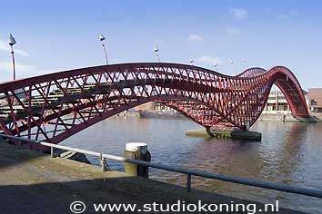 Ik noem deze in de volksmond genaamde Pythonbrug "De Ellen ten Damme brug". Ellen woont er namelijk pal naast in een boot en is net zo mooi, lenig en verrassend als deze brug. Gezien vanaf de Stuurmankade op het Borneoeiland kijkend naar de Panamakade op Sporenburg |