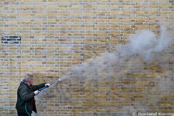 Het verwijderen van graffiti aan de achterzijde van de "Wolkenkrabber" aan het Victorieplein; foto 09-12-2011 |