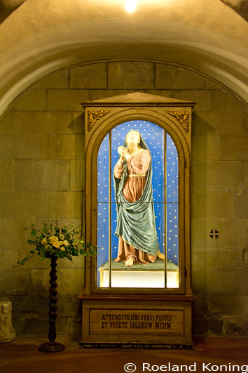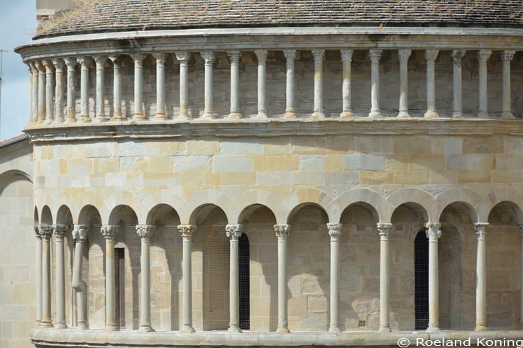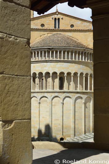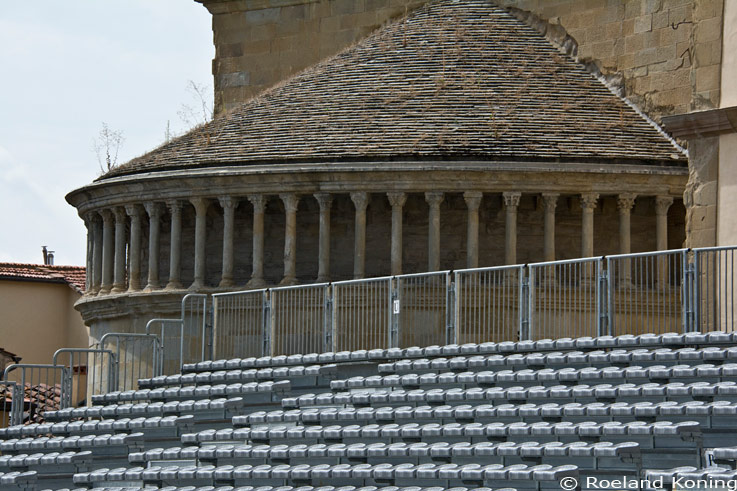 | Piazza Grande van Arezzo, apsis van de Pieve di Santa Maria uit 1140. Let op ket genikte zuiltje links onder. | |