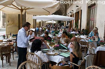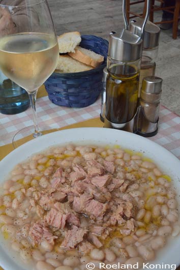 | Piazza Grande, onder de galerij van Versari een Taditioneel Toscaans gerecht. Ik vind het leuk om ook overal te proberen wat ik zelf maak. Foto bij een restaurantje zoals het dus niet moet. Pleur een potje witte benen open en een blikkie tonijn en voila! Voor de goede orde dus maar even mijn receptje hoe het wel moet, frummeltje meer moeite maar dan heb je ook wat: witte bonen in vergiet onder koud water afspoelen en laten uitlekken. Dressing roeren van azijn, olie, zout en peper. Peterselie fijnknippen. Sjalotjes pellen en klein snijden. Bonen, tonijn, peterselie en dressing door elkaar scheppen en over de bordjes verdelen. Garneren met bijvoorbeeld ansjovis. | |