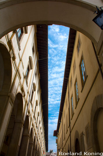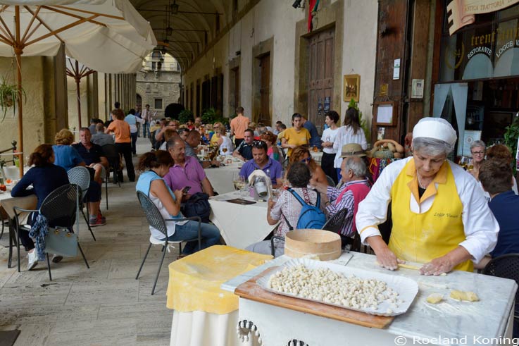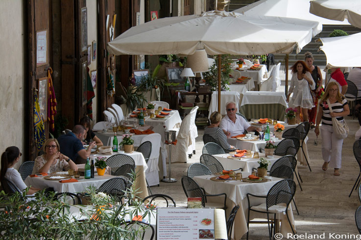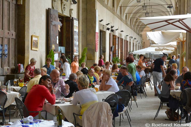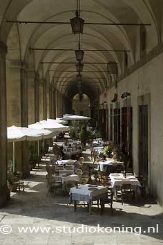 | Piazza Grande, onder de galerij van Vasari zijn een aantal restaurantjes te vinden. Je kan er verse pasta eten. | |